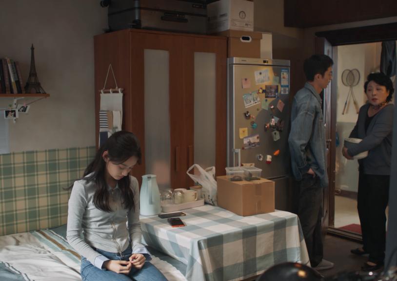 狭小的空间让整个镜头画面都略显局促,仿佛是从学生时代“继承”下来的格子床上四件套更具权威性,这不就是现实照进了偶像剧嘛!